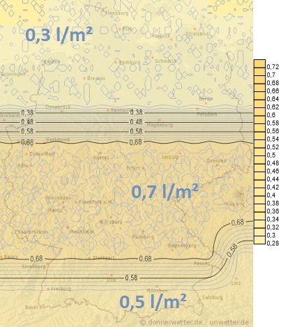 Im Laufe des Montags zieht mit kräftig auffrischendem Wind wieder vermehrt Regen auf. Die Mengen liegen dabei zwischen 5 und 10 Liter pro Quadratmeter.
