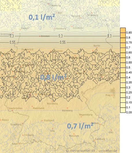 Heute stellt sich im Westen und in der Mitte eine leichte Wetterberuhigung mit örtlichen Schauern ein. Im Norden, sowie am Alpenrand fällt jedoch weiterhin Niederschlag, ganz im Norden, sowie in den Bergen teils als Schnee. Die Mengen liegen zwischen 5 und 15 Liter pro Quadratmeter.