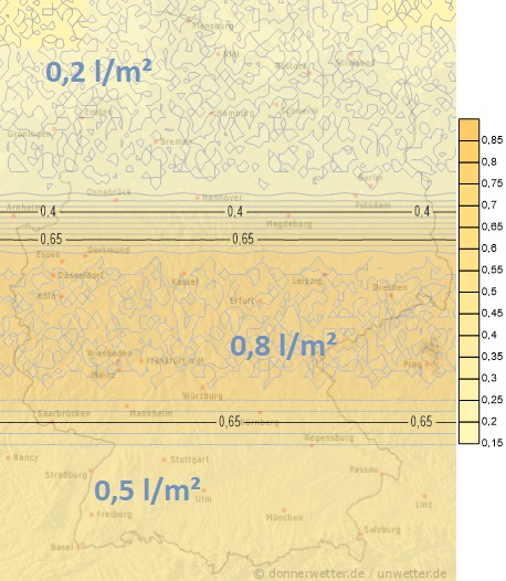 Im Laufe des Montags zieht mit kräftig auffrischendem Wind wieder vermehrt Regen auf. Die Mengen liegen dabei zwischen 5 und 10 Liter pro Quadratmeter.