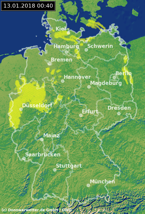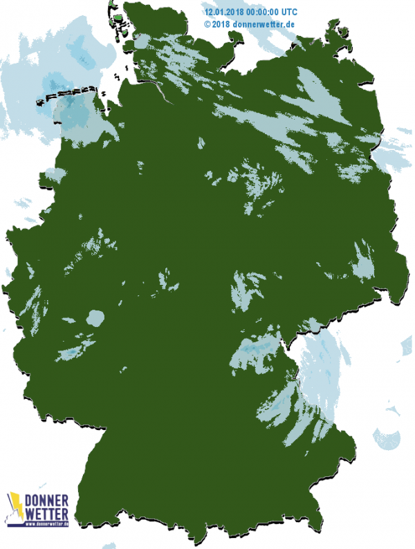 Das Radarbild zeigt aktuell einige schwache Signale, daraus fällt im Nordosten etwas Sprühregen oder Schneegriesel. Sonst ist der Himmel über Deutschland häufig wolkenverhangen, nur im Süden zeigen sich stellenweise die Sterne. Vor allem über der Mitte halten sich teilweise dichte Nebelfelder.