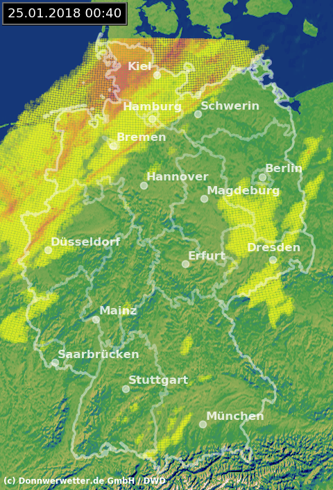 Das Radarbild zeigt aktuell leichte bis mäßige Signale mit Regen der über dem Nordwesten Deutschlands liegenden Kaltfront. Diese dringt im weiteren Verlauf der Nacht etwas weiter bis ins Landesinnere vor. Die sonstigen schwachen Signale deuten nicht auf Niederschlag hin. Der Himmel über Deutschlands präsentiert sich im Nordwesten wolkenverhangen, sonst zeigen sich zum Teil auch die Sterne.