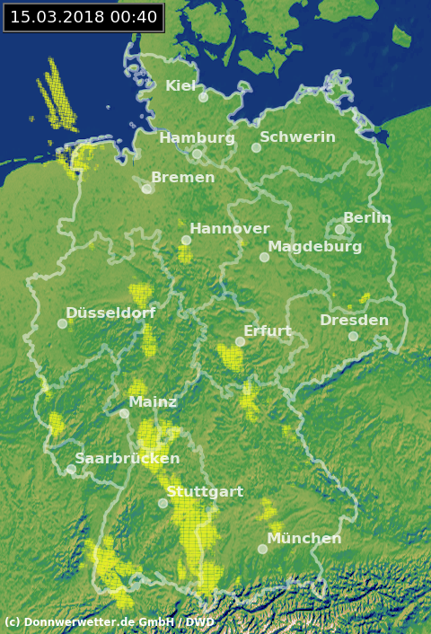 Das Radarbild zeigt aktuell zwar einige schwache Signale, hierbei handelt es sich aber nicht um Niederschlag. Der Himmel über Deutschland ist in der Südwesthälfte überwiegend sternenklar, im Nordosten hingegen meistens wolkenverhangen. In Bayern haben sich einzelne Nebelfelder gebildet.