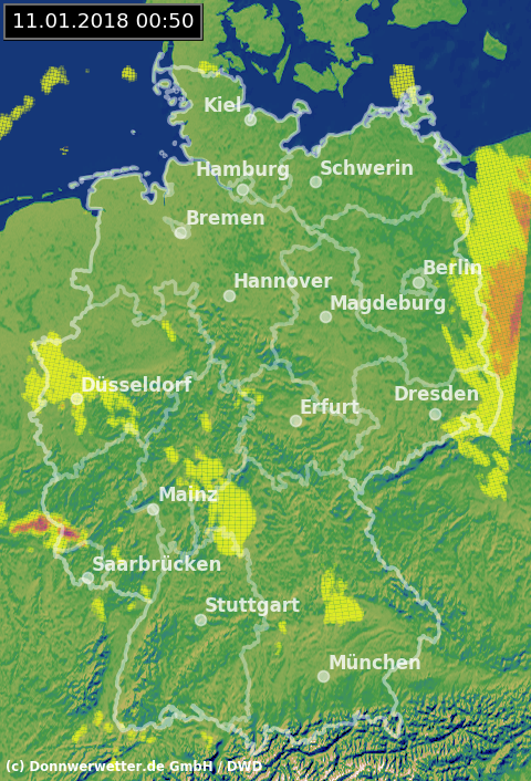 Das Radarbild zeigt aktuell im Südwesten einige schwache, bei Trier auch ein stärkeres Signal mit Regen. Auch von Polen schwappen in den nächsten Stunden Niederschlagssignale über die Oder ins Land herein. Sonst ist der Himmel über Deutschland häufig wolkenverhangen, in Teilen Niedersachsens, sowie Sachsen-Anhalts aber auch sternenklar. Vor allem im Nordosten und in Bayern halten sich häufig dichte Nebelfelder.