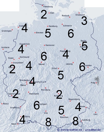 Die Benetzungsdauer erreicht in Deutschland bei auftretenden Schauern und Gewittern meist zwischen 2 und 8 Stunden.