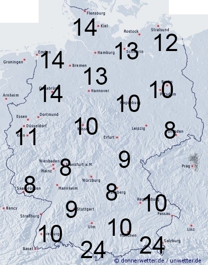 Vor allem im Westen und Norden muss mit Regen oder Schauern gerechnet werden. Sonst treten Niederschläge nur regional auf. Benetzung entsteht aber auch durch nächtlichen Tauansatz. Die Benetzungsdauer liegt zwischen 8 und 10 Stunden, im Westen und Norden bei häufigerem Regen zwischen 11 und 15 Stunden. Bei einer vorhandenen Schneedecke in den Bergen werden bis zu 24 Stunden erreicht.