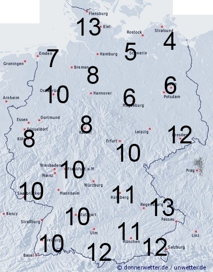 Regenfälle und Schauer sorgen in Deutschland teilweise für höhere Benetzungszeiten. Vor allem im Süden, sowie in Schleswig-Holstein liegt die Benetzungsdauer meist zwischen 10 und 13 Stunden. Sonst gibt es zwischen einigen Schauern auch mal längere trockene Abschnitte. Hier werden zwischen 4 und 10 Stunden erreicht.