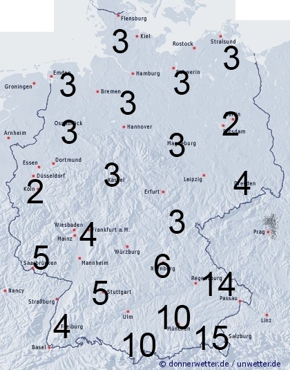 In Deutschland muss gebietsweise mit Regenschauern gerechnet werden. Sonst entsteht Benetzung durch nächtlichen Strahlungstau. Die Benetzungsdauer liegt allgemein zwischen 2 und 6 Stunden. In Süd und Ostbayern regnet es auch für längere Zeit. Im Alpenvorland und im Bayrischen-Wald erreicht die Benetzungsdauer zum Teil zwischen 10 und 15 Stunden.