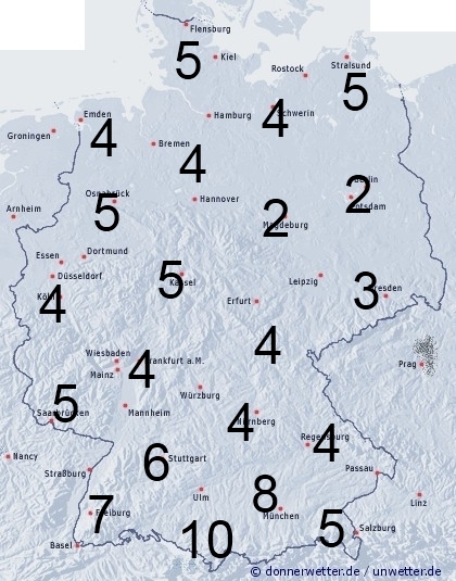 In Deutschland treten gebietsweise Schauer auf, im Süden regnet es zum Teil auch mal für längere Zeit. Sonst entsteht Benetzung durch nächtlichen Strahlungstau. Die Benetzungsdauer liegt allgemein zwischen 2 und 6 Stunden, im Schwarzwald, sowie im Alpenvorland können auch zwischen 7 und 10 Stunden erreicht werden.