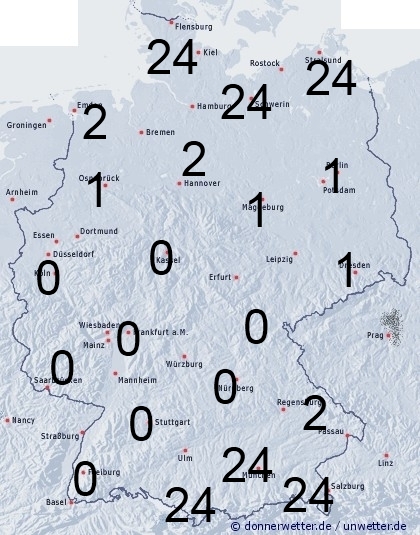 Ganz im Norden kann es strichweise noch schneien oder zu Schneeschauern kommen. Sonst sorgt der trockene und eisige Nordostwind kaum für Benetzung. Die Benetzungsdauer liegt in Deutschland allgemein zwischen 0 und 2 Stunden. Bei einer vorhandenen Schneedecke werden bis zu 24 Stunden erreicht.