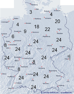 Die Benetzungsdauer bleibt in den Gebieten mit einer Schneedecke bei 24 Stunden. Sonst werden nur mit nächtlichem Strahlungstau und Reif sieben bis zehn Stunden erwartet. Unter dichten Wolken in schneefreien Gebieten sind es unter fünf Stunden.