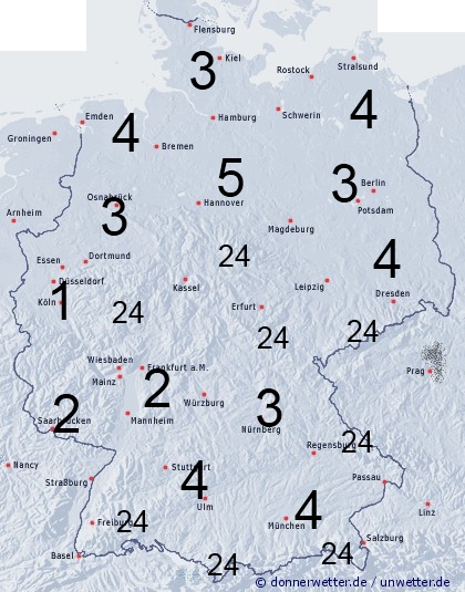 Die Benetzungsdauer liegt bei einer Schneedecke in den Bergen bei 24 Stunden. Sonst pendelt sie zwischen 1 und 4 Stunden. Bei örtlichem Regen können auch 5 Stunden, oder etwas mehr erreicht werden.