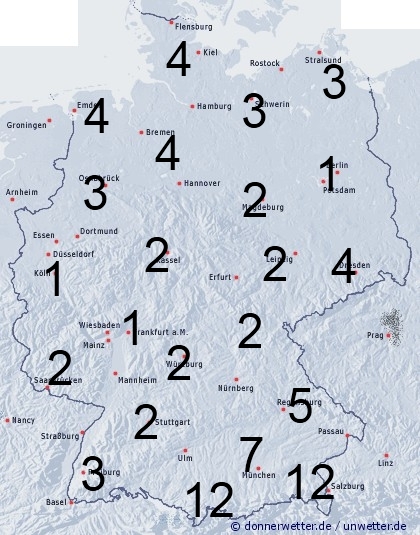 Im Alpenvorland sorgen zunächst noch teils kräftige Regenfälle für eine Benetzung von 7 bis 12 Stunden. Sonst entsteht leichte Benetzung von 2 bis 4 Stunden durch örtliche Schauer, die vor allem im Norden auftreten, oder nächtlichen Strahlungstau.