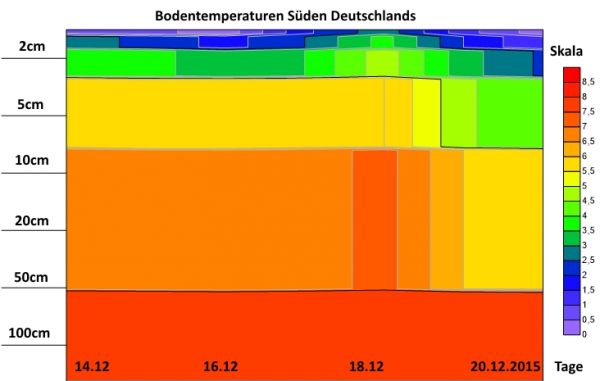 Bodentemperaturen vom 14.12.2015 bis zum 20.12.2015, für den Süden Deutschlands.