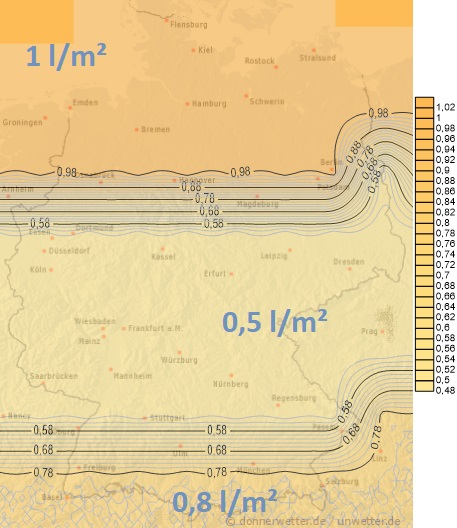 Heute erreicht der Regen im Tagesverlauf auch die südlichen und östlichen Gebiete unseres Landes. Im Nordwesten treten anfangs noch Schauer auf. Die Niederschlagsmengen liegen allgemein zwischen 5 und 25 Liter pro Quadratmeter, trocken bleibt es bis zum Abend nur an der Oder, sowie im östlichen Bayern.