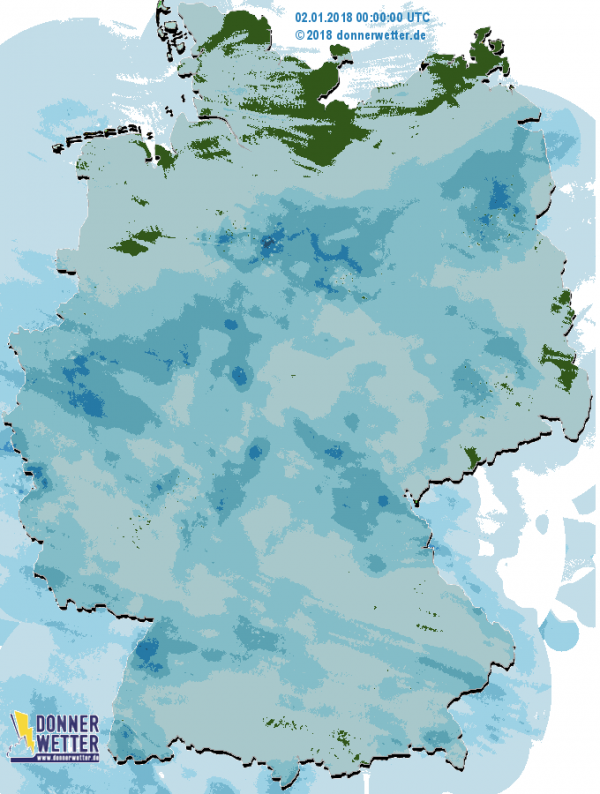 Das Radarbild zeigt aktuell schon über der gesamten Westhälfte zum Teil stärkere Signale mit Regen und Sprühregen. Auf den Bergen fällt teilweise noch Schnee. Sonst ist der Himmel über Deutschland meistens wolkenverhangen, lediglich ganz im Osten zeigen sich noch die Sterne.