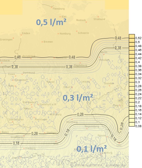 Heute fällt gebietsweise zum Teil bis in tiefere Lagen Schnee oder Schneeregen, dabei sind Niederschlagsmengen zwischen 1 und 10 Liter pro Quadratmeter zu erwarten. Im Nordosten bleibt es meistens trocken.