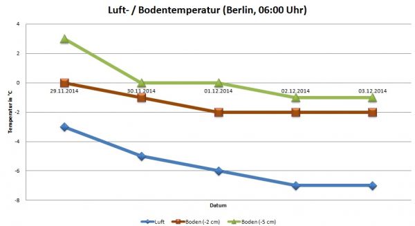 In den beiden folgenden Tabellen zeigt sich die Entwicklung von Luft- und Bodentemperatur (-2 cm, -5 cm) in den kommenden Tagen an den Beispielen Berlin und Köln.