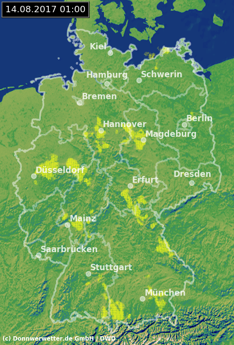 Am Dienstag wird es oft sehr warm und schwül, nachmittags ziehen von Westen wieder verbreitet Regengüsse und Gewitter auf, die örtlich auch wieder kräftig ausfallen können und in der Nacht auch die östlichen Landesteile und Bayern erreichen. Dabei können örtlich über 25 Liter pro Quadratmeter fallen.
