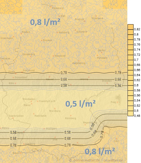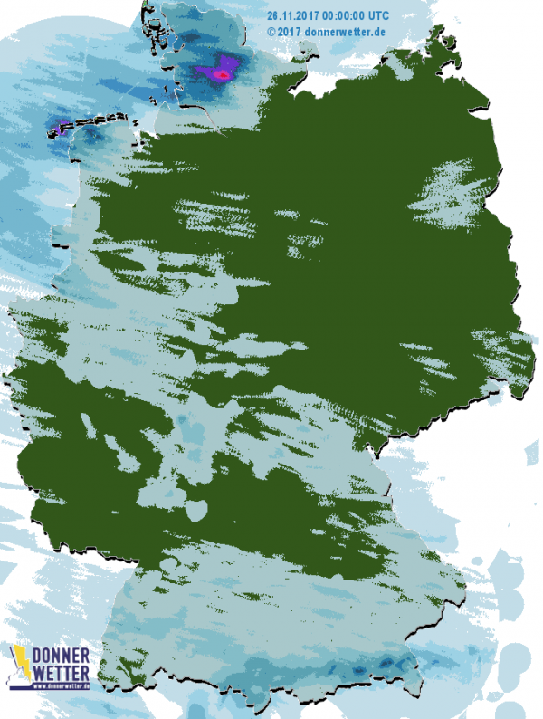 Heute dringt mit stark auffrischendem Wind von der Nordsee her neuer Regen bis ins Landesinnere vor. Die Schneefallgrenze steigt vorübergehend bis in die Gipfellagen der Mittelgebirge. Die Niederschlagsmengen erreichen meistens zwischen 5 und 20 Liter pro Quadratmeter.  Im Süden bleibt es tagsüber zunächst eher trocken.