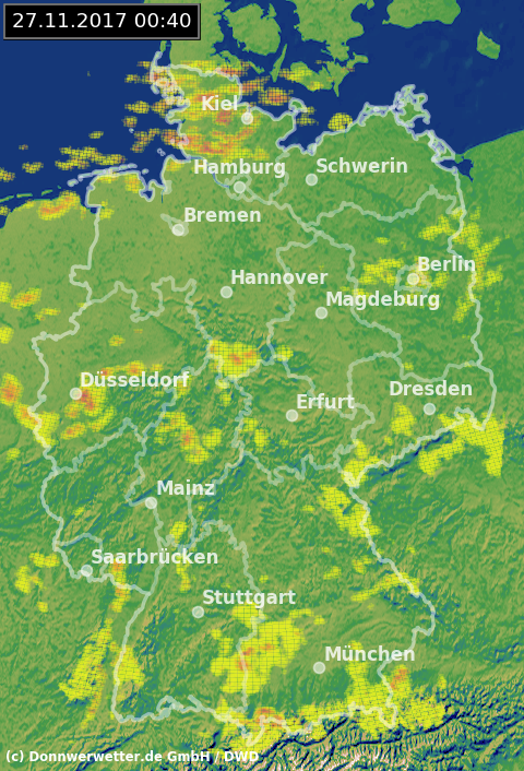 Das Radarbild zeigt aktuell örtliche Niederschlagssignale und vor allem über Schleswig-Holstein auch stärkere Schauersignale. Im Süden fällt in höheren Lagen örtlich Schnee, sonst meist Regen. Der Himmel über Deutschland ist überwiegend wolkenverhangen und nur im Nordwesten auch aufgeklart. Vereinzelt haben sich Nebelfelder gebildet.
