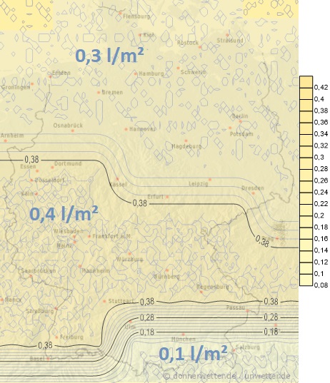 Auf Montag überquert uns von den Benelux-Staaten her ein ausgedehnteres Niederschlagsgebiet, wobei bei leichter Milderung die Niederschläge im Nordwesten in Regen übergehen, im Südosten jedoch weiterhin als Schnee fallen. Bei Niederschlagsmengen zwischen 5 und 15 Liter pro Quadratmeter muss verbreitet mit Verkehrsbehinderungen durch Schneeglätte gerechnet werden.