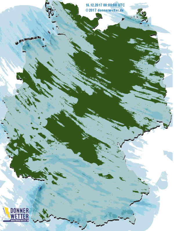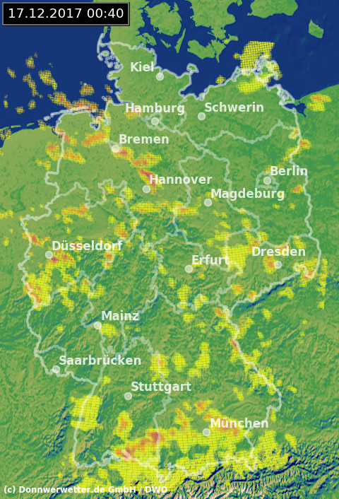 Das Radarbild zeigt aktuell örtliche leichte bis mäßige Signale mit Regen oder Schneeregen  im Flachland und Schnee oberhalb etwa 300 bis 500 m. Sonst ist der Himmel über Deutschland meistens wolkenverhangen, nur in Schleswig-Holstein und Niedersachsen funkelt teilweise die Sterne.