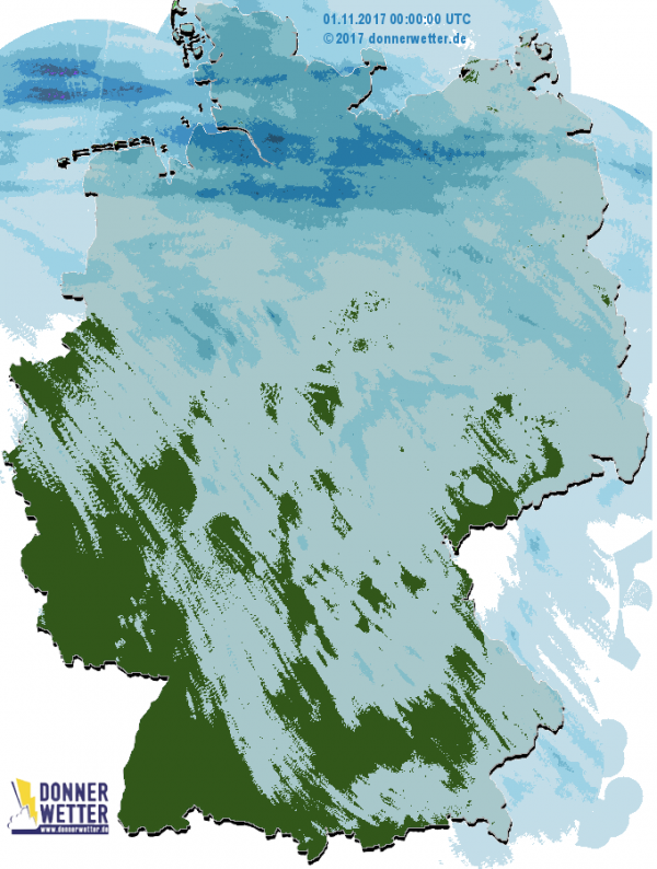Das Radarbild zeigt aktuell im Norden ausgeprägte Niederschlagssignale. Häufig fällt leichter bis mäßiger Regen. Sonst ist der Himmel über Deutschland überwiegend wolkenverhangen und nur im Süden teilweise aufgeklart. Stellenweise haben sich Nebelfelder gebildet. Die Temperaturen liegen aktuell zwischen 0 Grad in Zwiesel / Bayrischer-Wald und 15 Grad in Wernigerode / Harz.