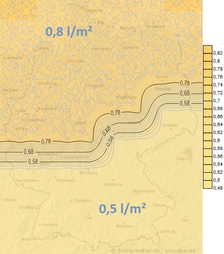 Heute regnet oder nieselt es nur noch örtlich. Die Niederschlagsmengen liegen dabei unter 3 Liter pro Quadratmeter.