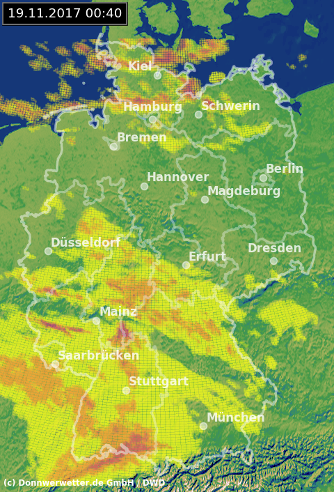 Das Radarbild zeigt aktuell über der Mitte und im Süden großräumige Niederschlagssignale und ganz im Norden stärkere Schauersignale. Im Bergland fällt Schnee. Sonst ist der Himmel über der Südhälfte Deutschlands häufig wolkenverhangen Im Norden teilweise aufgeklart. Vereinzelt haben sich Nebelfelder gebildet. Die Temperaturen liegen aktuell zwischen 0 Grad in Braunlage und 9 Grad auf Helgoland.