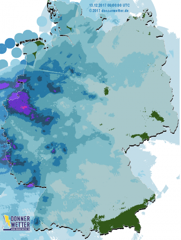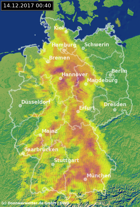 Das Radarbild zeigt aktuell verbreitet zum Teil stärkere Signale mit Regen in tieferen Lagen und Schnee auf den Bergen der Mittelgebirge. Niederschlagsfrei ist es aktuell im Westen, sowie im Nordosten. Hier zeigen sich zum Teil auch einige Sterne. Sonst ist der Himmel meistens wolkenverhangen.