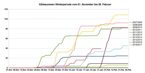 Damit rangiert der Winter 2016/17 im gesunden Mittelfeld der vergangenen 10 Jahre und ist sogar kälter als die vergangenen 3 Winter.