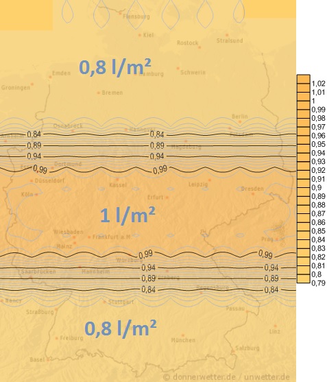 Am Sonntag überquert uns das Regengebiet allmählich von West nach Ost. Dabei können gebietsweise zwischen 10 und 25 Liter pro Quadratmeter fallen. Weniger wird es wohl im Norden sein.