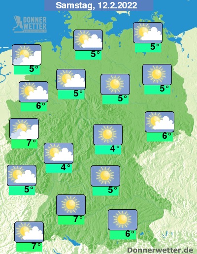 Heute zeigt sich das Wetter über dem Land vielerorts heiter bis sonnig. Im Tageserlauf können im Westen und Norden allerdings oft auch dichte Wolken aufziehen, es bleibt aber landesweit trocken. Die Temperatur steigt auf 4 Grad in in Erfurt und bis 7 Grad in Köln. An der Nordsee weht ein oft stürmischer Wind.