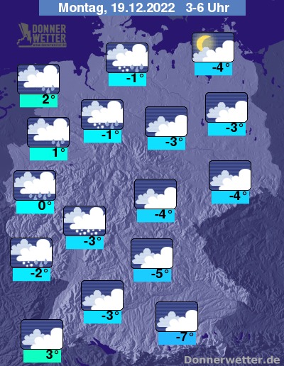 In der Nacht zum Montag ist es bereits landesweit bedeckt und von Westen her setzt Schneefall, Schneeregen und teils gefrierender Regen ein, dabei besteht extreme Glättegefahr! Lediglich in den östlichen Landesteilen bleibt es bis zum Morgen noch weitgehend trocken. Die Temperatur sinkt auf 3 Grad im Breisgau und bis -7 Grad im Berchtesgadener Land.