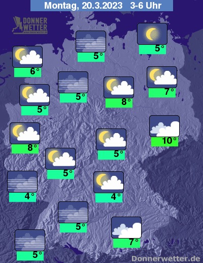 In der Nacht zum Montag klingt letzter Regen bald im Osten ab, sonst ist es schon meist gering bis wechselnd, vor allem im Südosten auch oft stark bewölkt, jedoch weitgehend trocken. Die Temperatur sinkt auf 10 Grad in Dresden und bis 4 Grad in Saarbrücken.