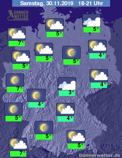 In der Nacht zum Sonntag bleibt es über der Nordosthälfte des Landes meist sternenklar oder nur leicht bewölkt. Dagegen ziehen im Südwesten und im Verlauf auch im Westen und Süden zunehmend dichtere Wolken auf, die zum Morgen hin im Südwesten auch Regen, Schneeregen oder Schnee bringen können. Im übrigen Land bleibt es trocken bei 4 Grad in Emden und bis -4 Grad in Suhl.