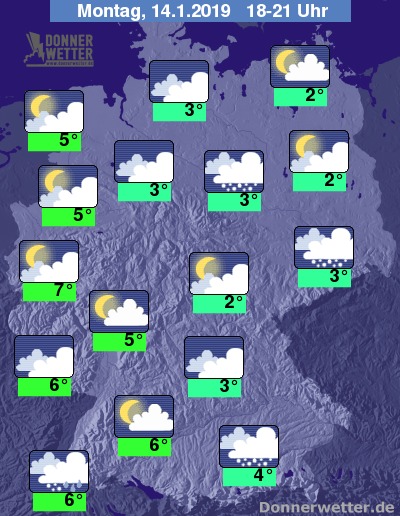 Am Abend fallen entlang der Elbe sowie im Erzgebirge und an den Alpen noch Schneefälle, in den übrigen Landesteilen bleibt es meist trocken. Der Himmel zeigt sich dabei teils bedeckt, teils aufgelockert bewölkt.