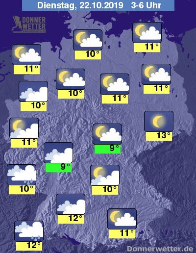 In der Nacht auf Dienstag bleibt der Himmel über der Westhälfte des Landes bedeckt oder aufgelockert bewölkt und vor allem im Südwesten setzten sich Schauer zunächst noch fort. In den übrigen Landesteilen überwiegen lockere Wolken und es bleibt trocken.