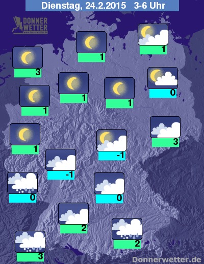 In der kommenden Nacht fällt im Süden unter meist dichten Wolken vielerorts Regen, Schneeregen oder Schnee, dabei besteht oft Glättegefahr. Besonders am Alpenrand fallen bis zu 20 cm Neuschnee. Im Norden und Westen klart der Himmel auf. In den übrigen Landesteilen ist es oft stark, teils auch aufgelockert bewölkt und dazu trocken. Die Temperatur sinkt auf 3 Grad an der Nordseeküste und bis -1 Grad am Taunus. Achtung überfrierende Nässe.