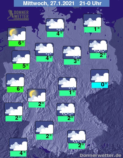 Am Abend kommt der Niederschlag weiter ostwärts voran und fällt in höheren Lagen als Schnee, in den Niederungen eher als Regen oder Schneeregen. Vor allem im Bergland muss mit Straßenglätte gerechnet werden. Sowohl vor der Front, als auch dahinter kann die Wolkendecke stellenweise auflockern und einigen Sternen Platz machen.