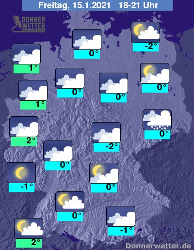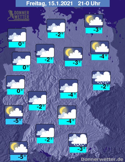 Die Temperaturn rutschen bis Mitternacht häufig in den frostigen Bereich zwischen -5 Grad, dort wo es längere Zeit aufklart und 0 Grad von der Kölner Bucht bis zur Nordsee.
