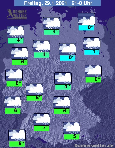 Am Abend fällt im Bereich der Luftmassengrenze über Norddeutschland teils kräftiger Schneeregen, in etwas höheren Lagen wahrscheinlich auch Schnee mit Glättegefahr. Auch südlich davon fällt Niederschlag, allerdings bei milden Temperaturen in Form von Regen, im Hunsrück, sowie im Schwarzwald auch intensiver mit Überflutungsgefahr an den Flüssen. Trocken bleibt es wahrscheinlich nur im Ostseeumfeld.