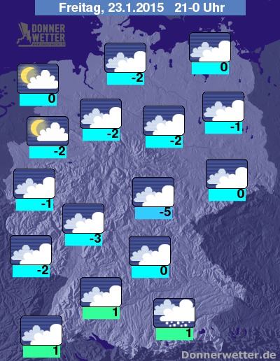 Am Freitag ziehen sich die Schneefälle meist ins Alpenvorland zurück, dabei kann es hier teils langanhaltend schneien. Auch in den anderen Landesteilen bleibt es überwiegend stark bewölkt oder trüb, jedoch weitgehend trocken. Hier und da kann die Bewölkung auch mal etwas auflockern, vor allem im Nordwesten ist es teils auch nur leicht bewölkt. Die Abendtemperatur liegt bei 1 Grad im Chiemgau und um -5 Grad im Thüringer Becken.