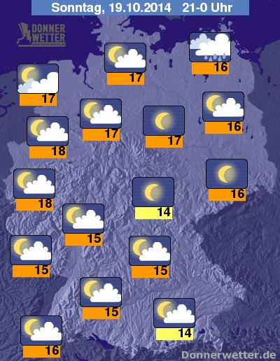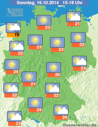 Heute Nachmittag strahlt die Sonne noch von einem häufig auch wolkenlosen Himmel, sonst ziehen meist nur lockere Wolken durch. Im Nordwesten ziehen jedoch dichte Wolken mit Regen auf, sonst bleibt es aber trocken. Die Temperatur liegt bei 19 Grad im nördlichen Ostfriesland und bei teils 24 Grad im Süden und Westen der Republik.