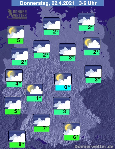 In der Nacht zum Donnerstag ist es vor allem anfangs noch oft gering bewölkt oder sternenklar, gebietsweise aber auch schon stark bewölkt. Im weiteren Verlauf nimmt der Wolkenanteil insgesamt zu, zum Teil bleibt es aber bis zum Morgen noch aufgelockert bewölkt, dazu bleibt es weitgehend trocken. Die Temperatur sinkt auf 8 Grad im Breisgau und bis 0 Grad im Eichsfeld.