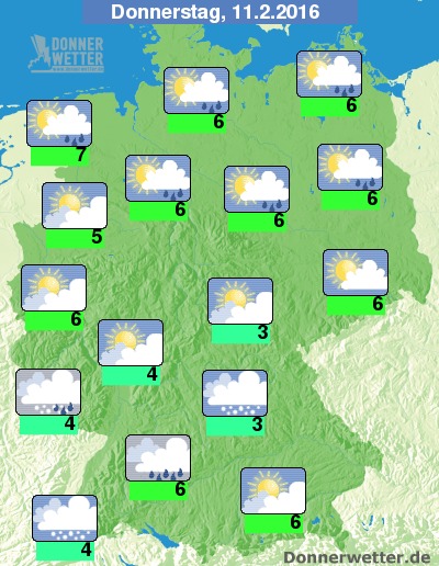 Heute zieht häufig wechselnde, zeitweise jedoch starke Bewölkung durch, dazu fällt gebietsweise Regen, nach Süden hin fallen die Niederschläge zumeist als Schnee. Die Temperatur steigt auf 3 Grad in Unterfranken und bis 7 Grad in Ostfriesland.