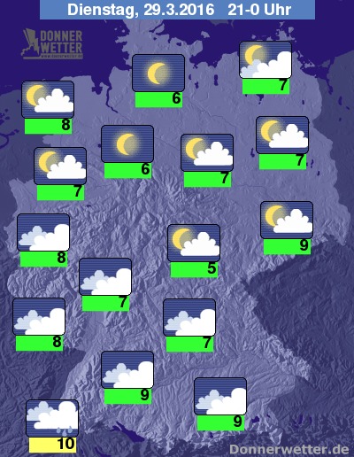 Heute Abend ist es vor allem über dem Norden und Osten Deutschlands meist nur locker bewölkt oder auch sternenklar. Weiter nach Südwesten hin ziehen jedoch bereits meist dichte Wolken durch und im weiteren Verlauf zieht im Süden und Westen oft Regen auf. Die Abendtemperatur liegt bei 10 Grad im Breisgau und um 5 Grad im Eichsfeld.
