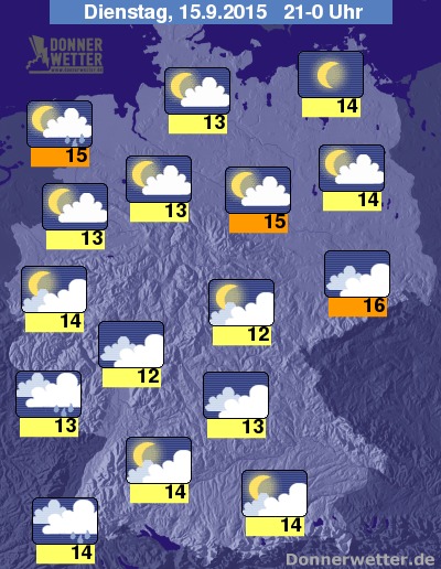 Heute Abend ist es über Deutschland zumeist noch leicht oder aufgelockert bewölkt und dazu trocken, vor allem im Süden und Osten ist es aber auch häufig stark bewölkt. Im weiteren Verlauf ziehen im Südwesten dichte Wolken mit Regen herein, gleichzeitig können sich auch im Nordseeumfeld einzelne Schauer bilden, sonst bleibt es jedoch trocken. Die Abendtemperatur liegt bei 16 Grad in Leipzig und etwa 12 Grad im Coburger Land. An der Nordsee weht anfangs noch ein starker bis stürmischer Südwestwind, dabei sind noch Sturmböen möglich.