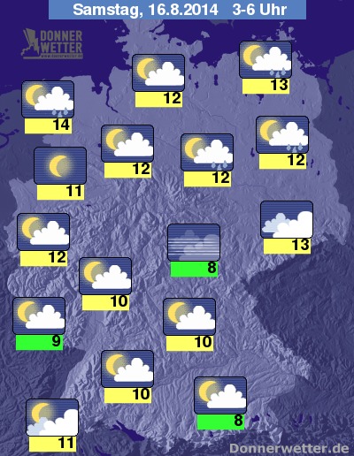 In der kommenden Nacht sind vor allem zu Beginn noch weitere Schauer, vereinzelt auch Gewitter möglich. Etwa ab Mitternacht lassen die Schauer meist nach, vereinzelt sind jedoch noch Niederschläge möglich. Die Temperatur sinkt auf 14 Grad an der nördlichen Ems und kühlen 8 Grad im Allgäu.