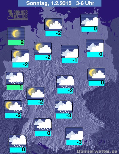 In der Nacht zum Sonntag halten sich in der Südhälfte von Deutschland meist dichte Wolken und es kann zu weiteren, zum Teil langanhaltenden Schneefällen kommen. Auch im Osten bleibt die Wolkendecke weitgehend dicht, hier fällt aber nur gelegentlich etwas Schnee. In den anderen Landesteilen ist es teils aufgelockert, teils stark bewölkt und weitgehend trocken. Die Temperatur sinkt auf 2 Grad in Wilhelmshaven und bis -3 Grad in Franken.